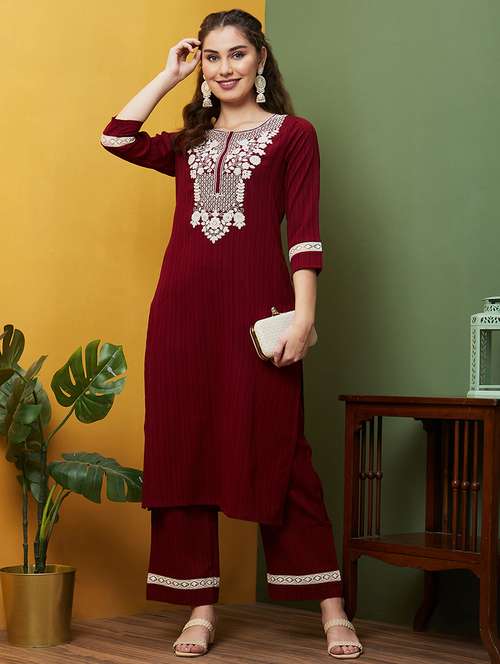 • Browse through the latest range of ethnic sets for women with tailored sleeve designs with embroidered works.