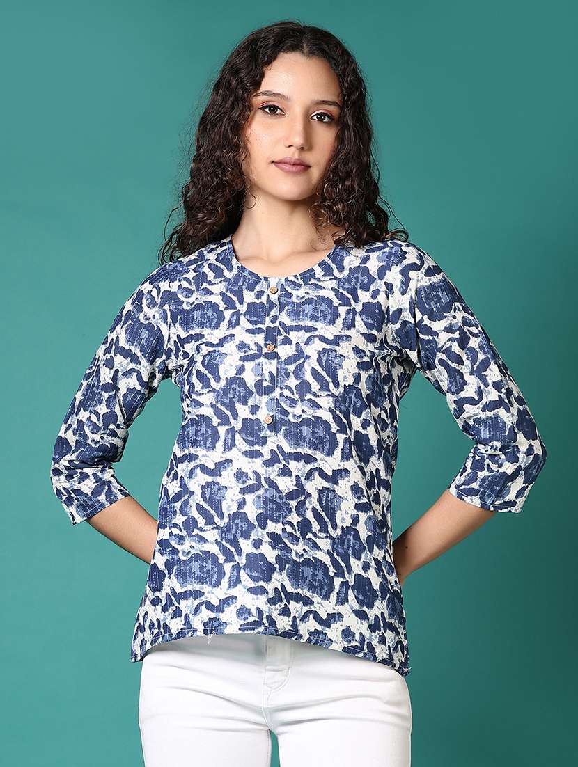 - » women blue printed round neck straight top
