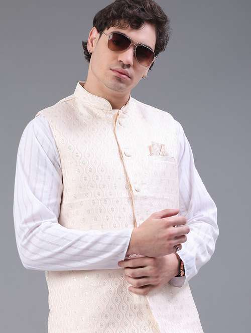 men solid with work mandarin neck regular fit nehru jacket