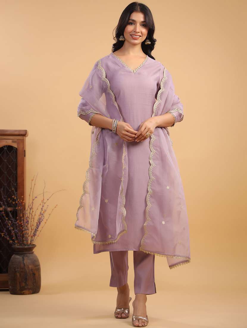 • Find gorgeous sets of ethnic wears in trending designs in lavender colors suitable for festive wear of occasions.