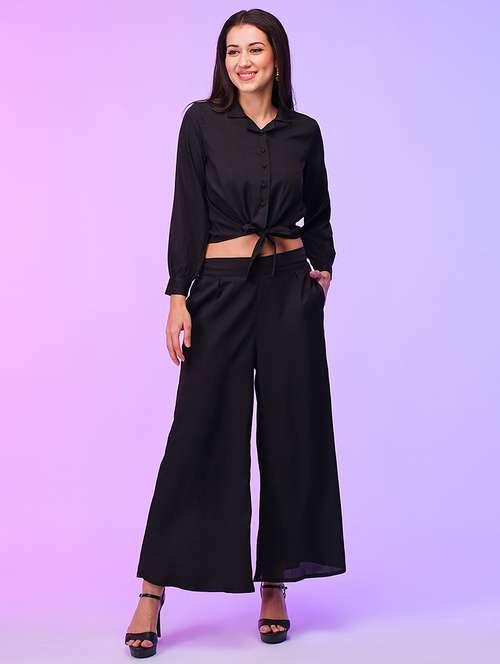 Embrace a soft and stylish look with the Globus Women's Lavender Front Tie Up Top & Palazzos Co-Ord Set. This casual set, in a soothing lavender shade, includes a front tie-up shirt with long sleeves and a shirt collar, coupled with flowing palazzos. Made from polyester, it ensures comfort and ease with slip-on and button closures, complete with two pockets.