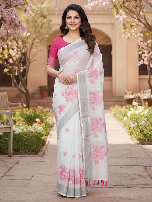 This White & Lavender linen saree features delicate floral embroidery, adding charm and elegance to your look. Made from premium linen, it drapes comfortably and gracefully. The saree includes an unstitched blouse piece, allowing you to tailor it to your style. Perfect for festive occasions and traditional celebrations, this saree is both beautiful and comfortable. Please note that the actual color and design may vary slightly from the images shown.