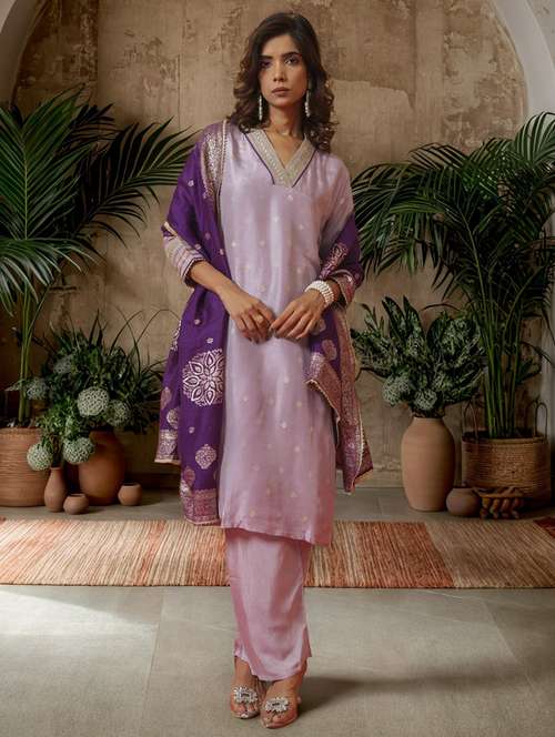- Find gorgeous sets of ethnic wears in trending designs in lavender colors suitable for festive wear of occasions.
