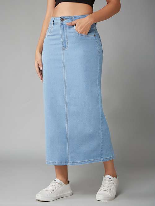 - » women solid high rise denim straight skirt
