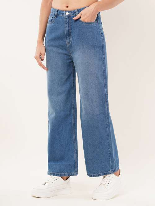 women solid mid rise wide leg jean