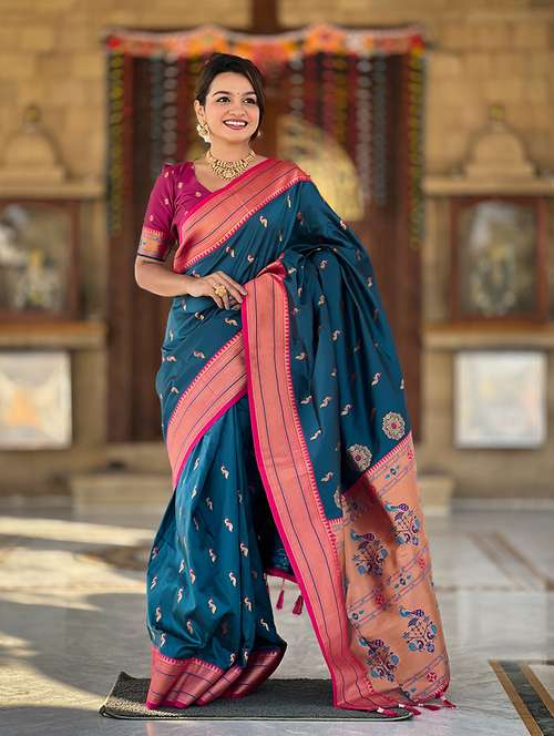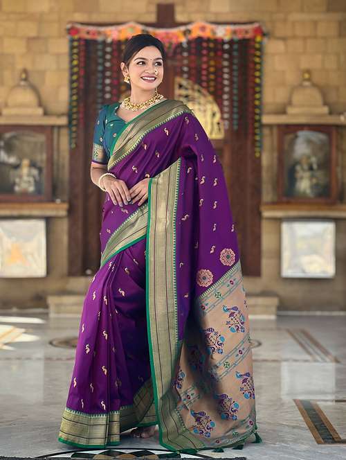 We offers Paithani Softy Silk Saree with Rich intricate Meenakari Golden Zari Jacquard work at all over Body, Border & Grand Pallu. Blouse, Border and Pallu have very fine contrast color matching with Saree body. Saree & Blouse Material is Litchi Silk which very Soft and Skin Friendly material. Saree has beautiful zalar (Tessel) work at pallu. This Saree has a length 6.30 Meter which Includes 0.8 meters of the blouse. These new Bollywood designer fashionable saree for women can be used as Party wear saree, Festival saree, wedding saree on every Occasions. Product colour may slightly very due to photographic lighting sources or your monitor settings.
