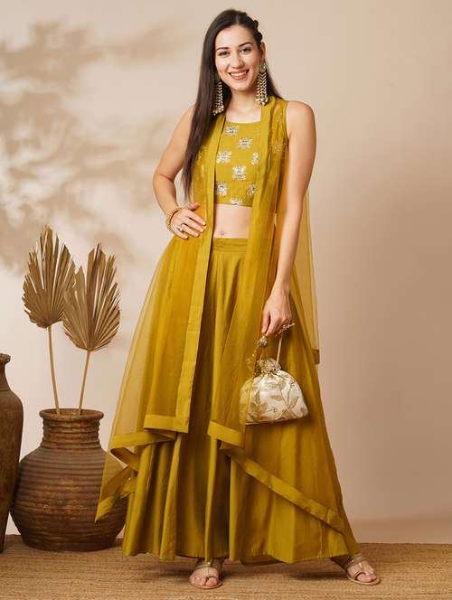 - » globus women lime green ethnic motifs strappy sleeves crop top & floor length palazzo with shrug fusion co-ord set