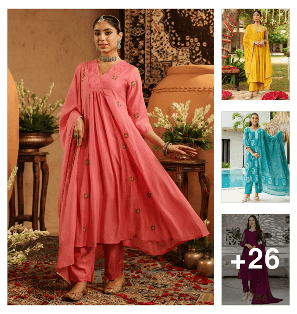 globus women grey v-neck gold zari embroidered panelled anarkali kurta with elasticated wide-leg pants festive set