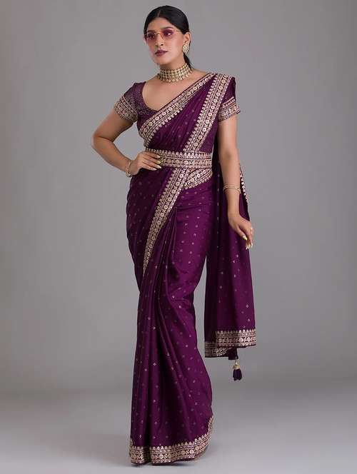 Wine Zariwork Chinon Designer Saree with heavy multi sequins work blouse