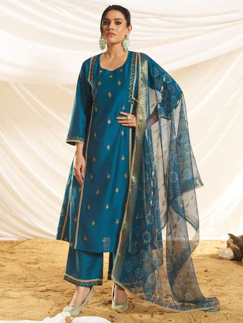 women embroidered three quarter sleeve kurta pant with dupatta set