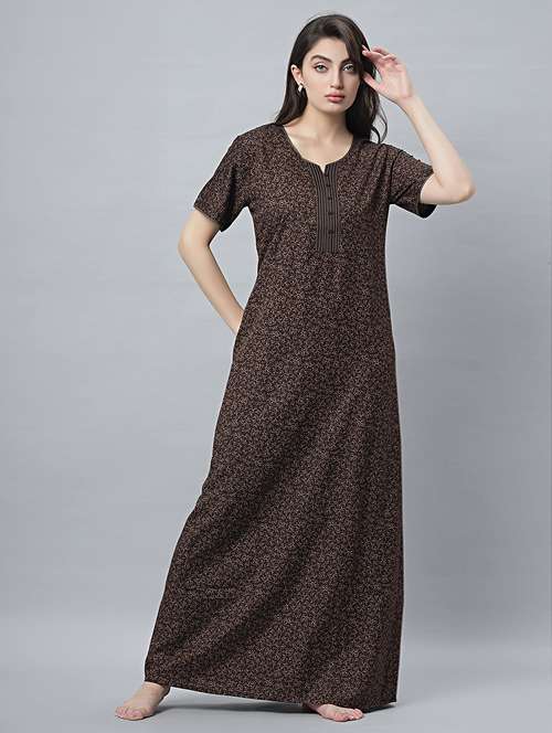 Quira Women's Wine Cotton Blend Printed Nighty - Half Sleeves, Round Neck, Long