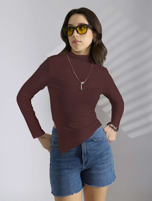 SHOWOFFFF Women's Maroon Asymmetric Hem Top with Neck Chain