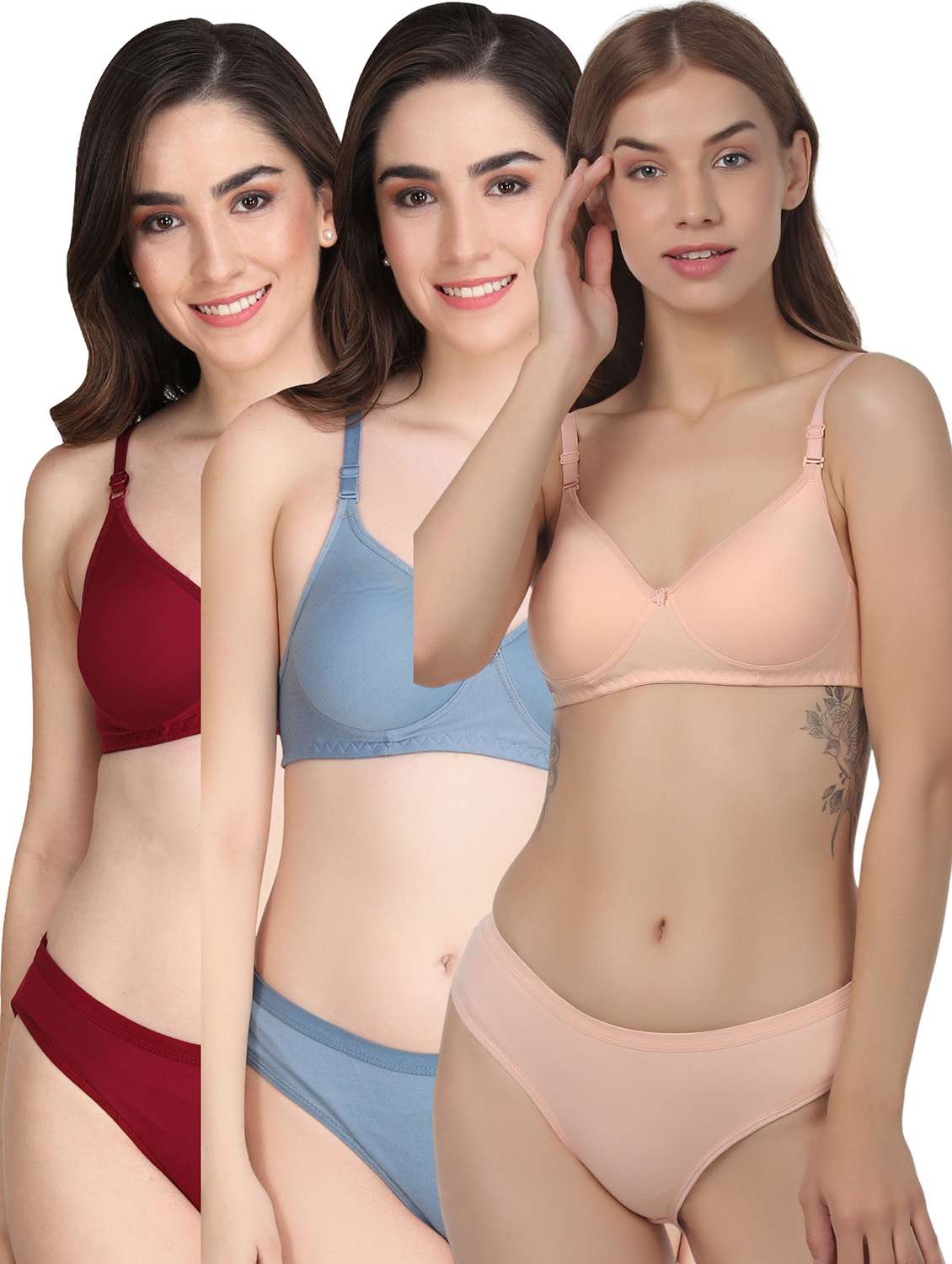 Liigne Women Everyday Padded Bra Panty Set (Pack Of 3) - This Lingerie Set Made of Pure Cotton