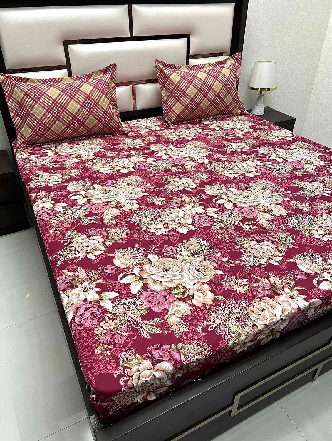 floral printed tc fitted king-sized bedsheet with 2 pillow covers