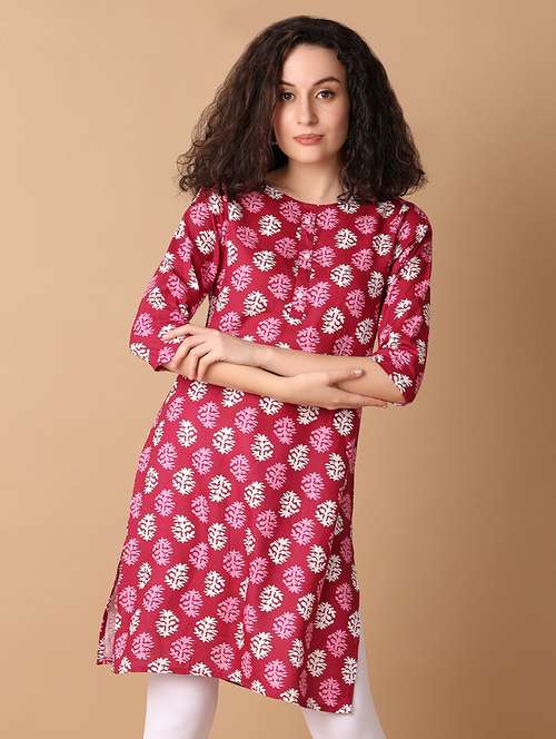 - Grab this beautiful kurta made up of rayon fabric featuring round neck designs.