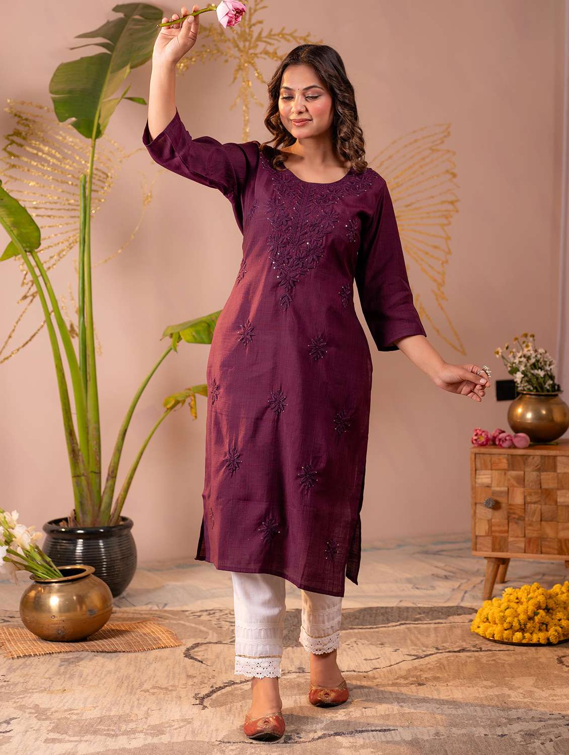 - Grab this beautiful kurta made up of viscose fabric featuring round neck designs.