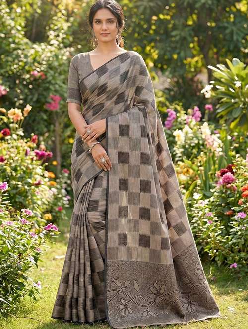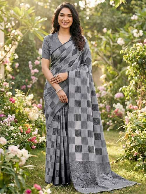 Sutriti Women Mauve & Black Checkered Linen Blend Saree with Floral Pallu