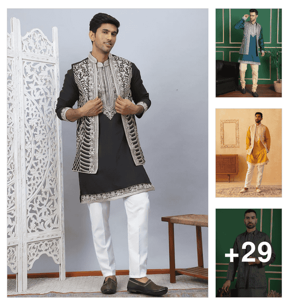 men embroidered mandarin neck kurta pyjama ethnic wear set