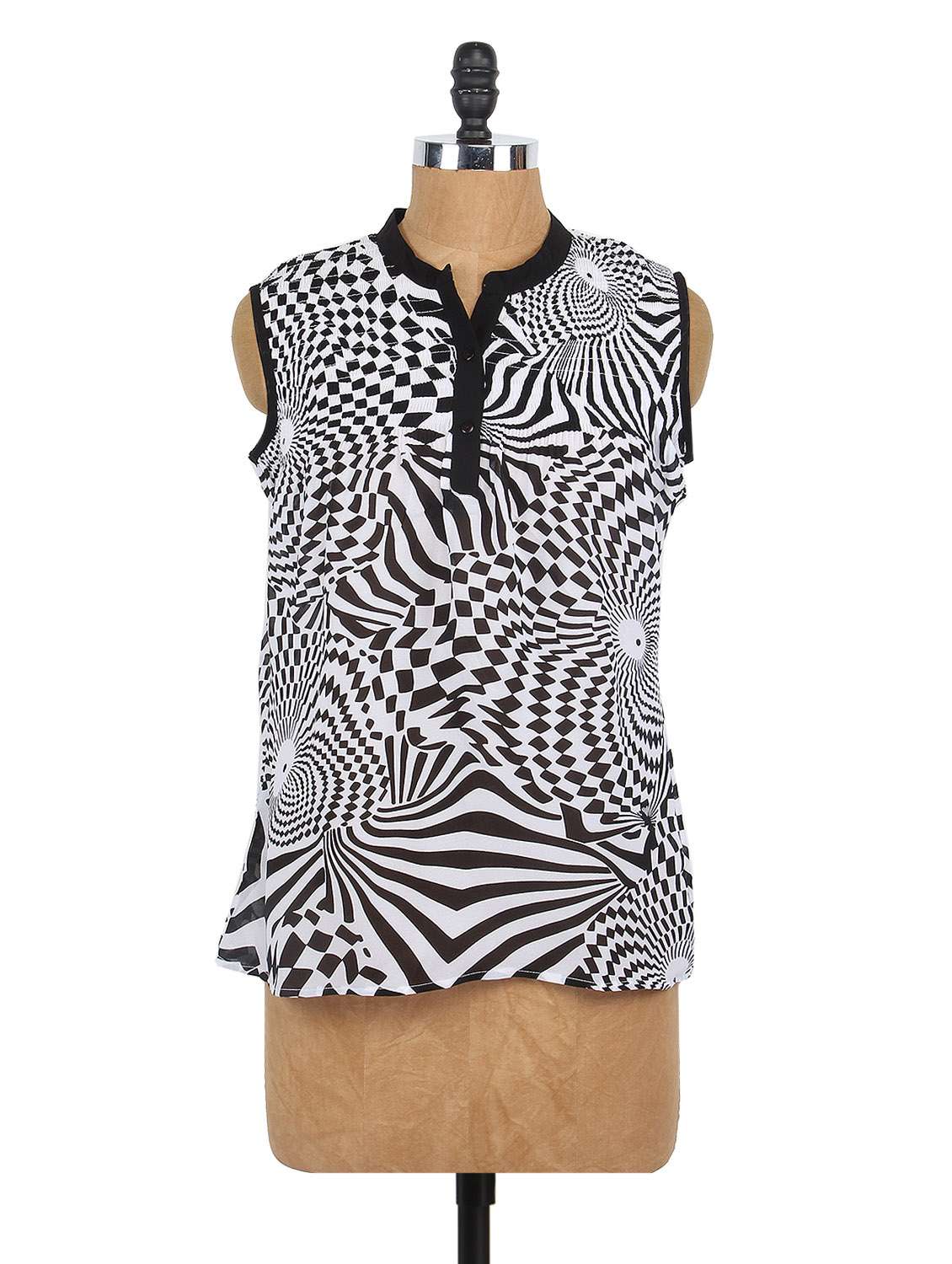 monochrome mandarin collar sleeveless top