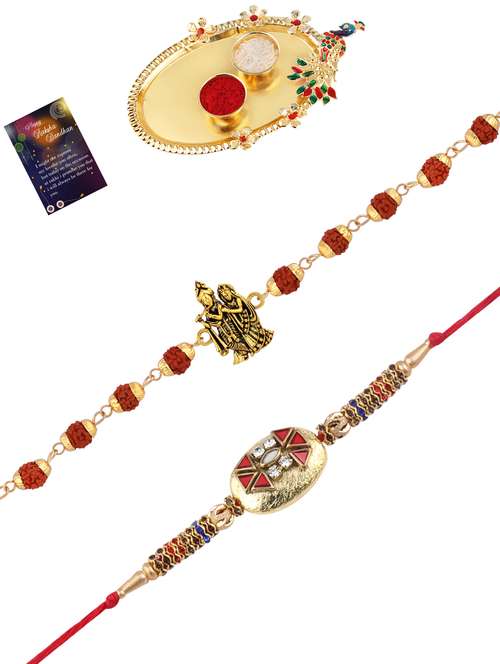 pack of 2 rakhi set with roli chawal, greeting card and kankawati pooja thali