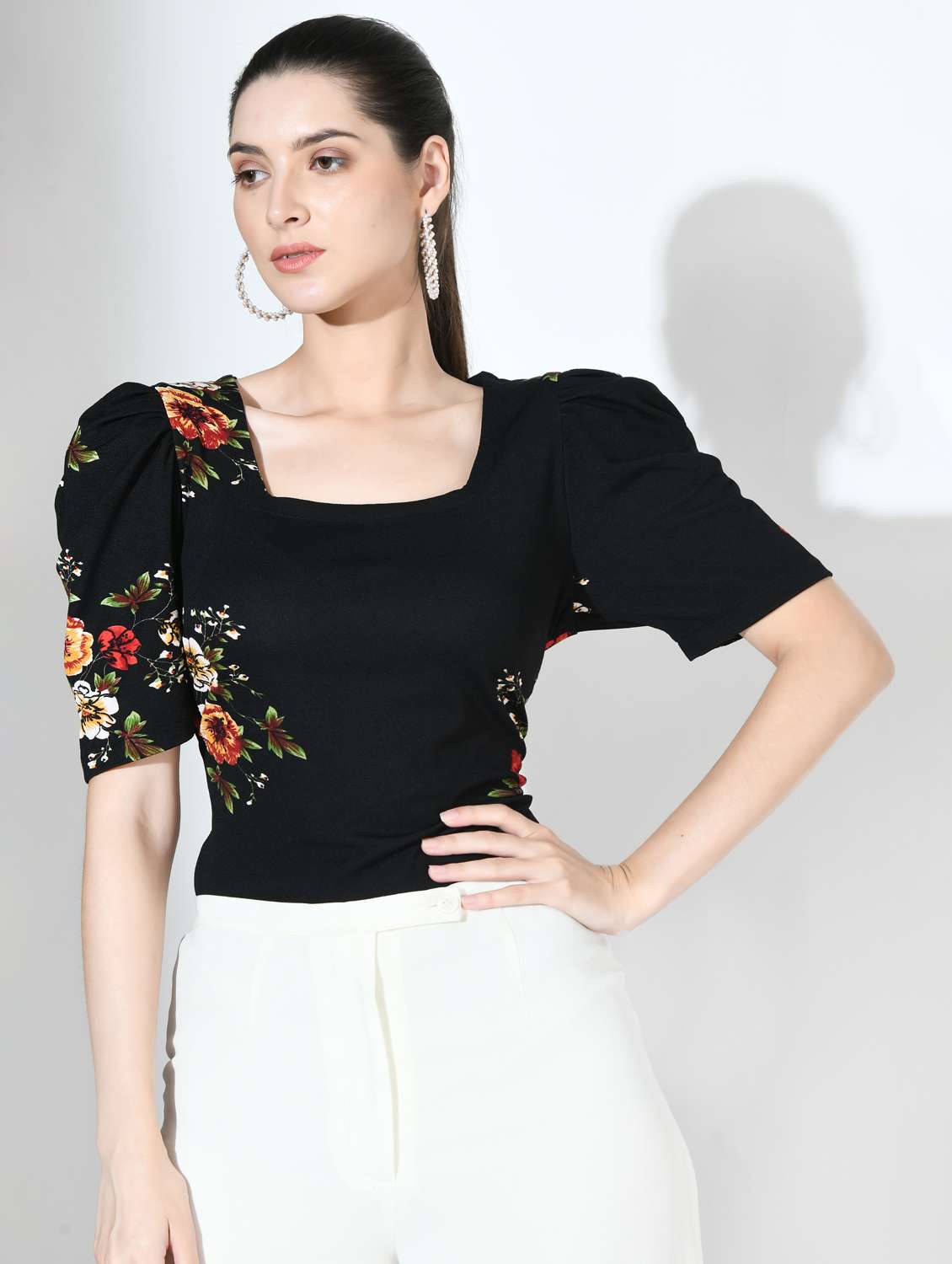 black floral printed detailed casual top