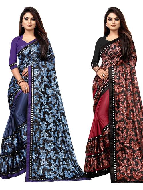 This Multi Color Combo offer Saree has printed Frill and Sequence Lace Border. We offer High Quality Range of Printed Sarees that is Designed by our team of Creative Professionals and at the same time perfect mix of modern patterns and contemporary designs of ethnic collection. This saree is crafted with Lycra fabric, which is further enriched with beautiful Floral prints that makes you look awesome and stunningly beautiful in this lovely half & half sari that is decorated with intricately printed Lycra Ruffles/Frill. Matching unstitched Banglory Silk Blouse Piece, which can be stitched as per your choice & requirement that add the glam. There might be color variation due to screen resolution and digital photography. This sari is an ideal for Occasions like casual, traditional, party wear, festival, wedding.