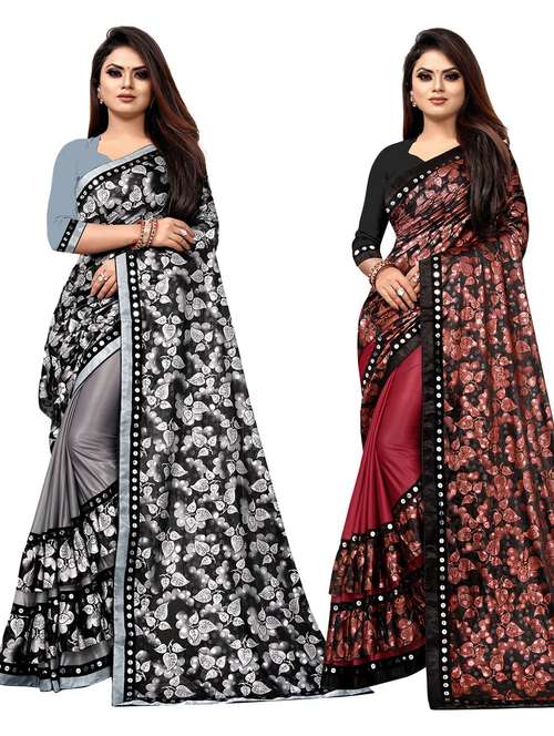 This Multi Color Combo offer Saree has printed Frill and Sequence Lace Border. We offer High Quality Range of Printed Sarees that is Designed by our team of Creative Professionals and at the same time perfect mix of modern patterns and contemporary designs of ethnic collection. This saree is crafted with Lycra fabric, which is further enriched with beautiful Floral prints that makes you look awesome and stunningly beautiful in this lovely half & half sari that is decorated with intricately printed Lycra Ruffles/Frill. Matching unstitched Banglory Silk Blouse Piece, which can be stitched as per your choice & requirement that add the glam. There might be color variation due to screen resolution and digital photography. This sari is an ideal for Occasions like casual, traditional, party wear, festival, wedding.