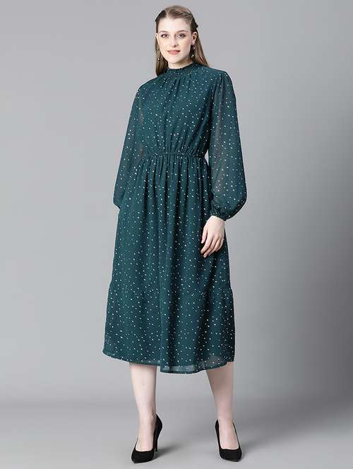 - Dress up in a soothing pattern and don this dress made of polyester material.