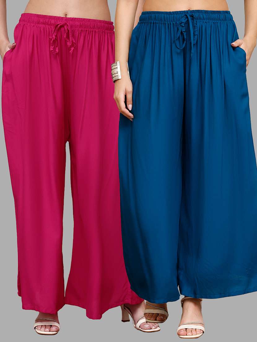 Upgrade your collection of warm-weather staples with these top-notch Pink and Dark Blue Plus pocket palazzos combo's by Valles365. Pair them with a flowy tee and lace-up sandals for a super chic look.