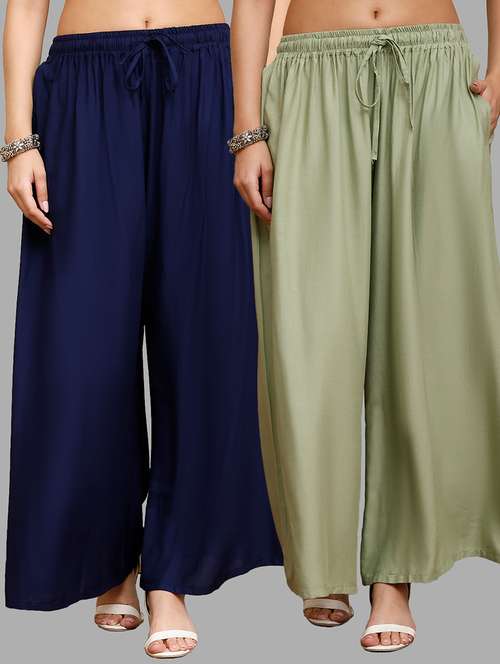 Upgrade your collection of warm-weather staples with these top-notch Navy Blue and Pista Green pocket palazzos combo's by Valles365. Pair them with a flowy tee and lace-up sandals for a super chic look.