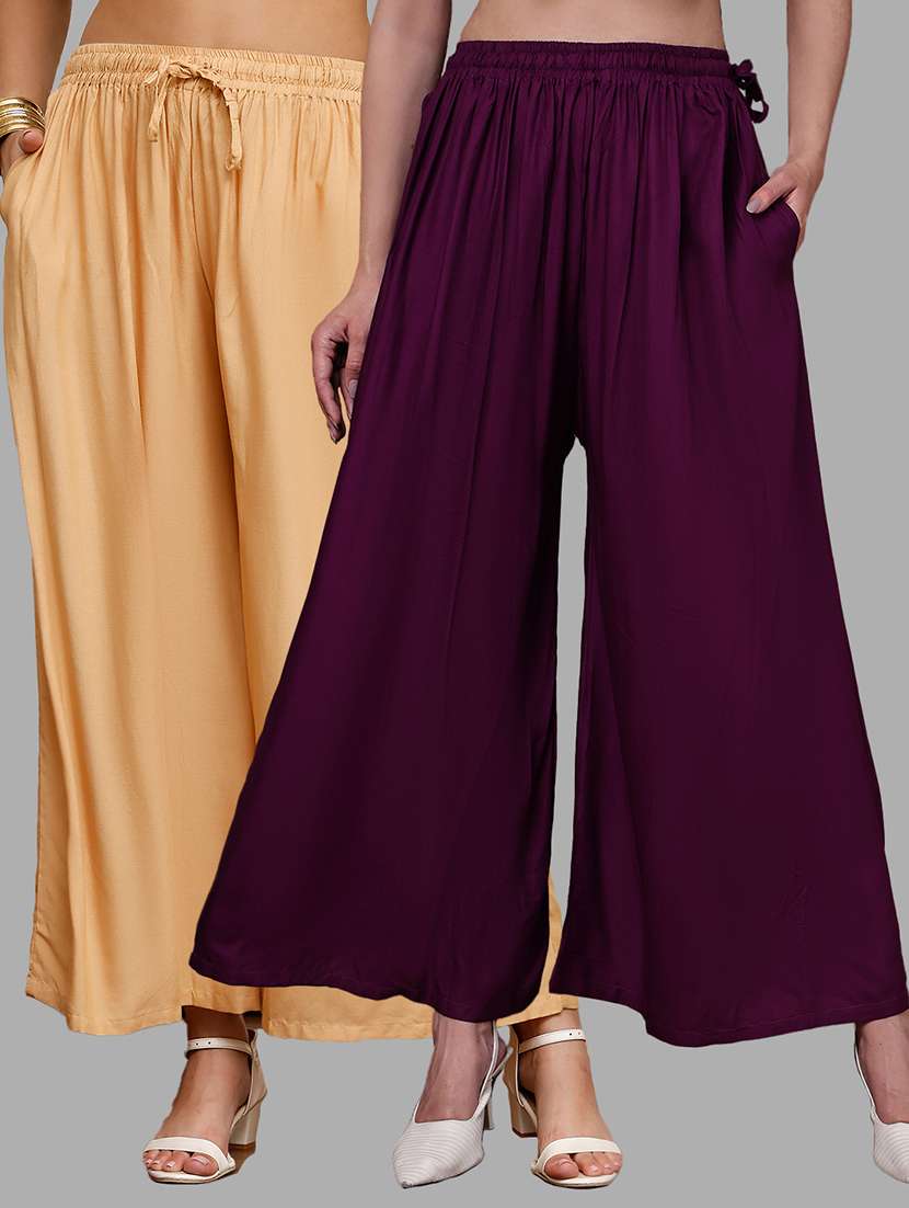 Upgrade your collection of warm-weather staples with these top-notch Purple and Beige Plus Pocket Palazzos combo's by Valles365. Pair them with a flowy tee and lace-up sandals for a super chic look.