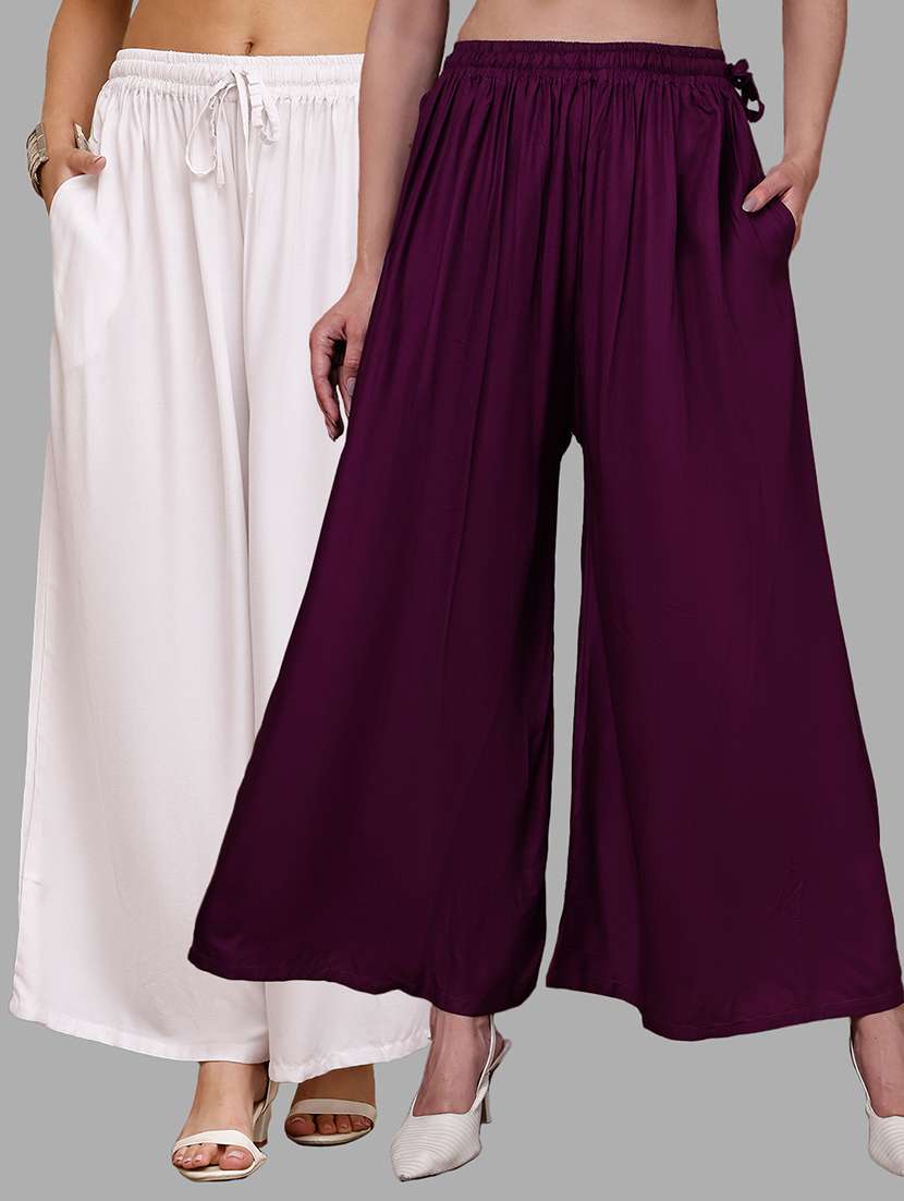 Upgrade your collection of warm-weather staples with these top-notch Purple and White Pocket Palazzos combo's by Valles365. Pair them with a flowy tee and lace-up sandals for a super chic look.