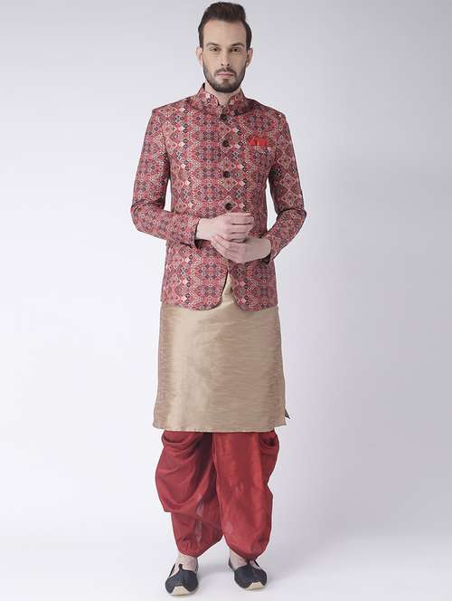- » beige solid dhoti kurta set with multi colored jacquard bandhgala jacket