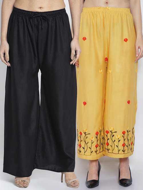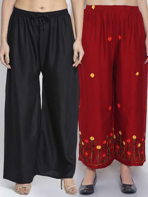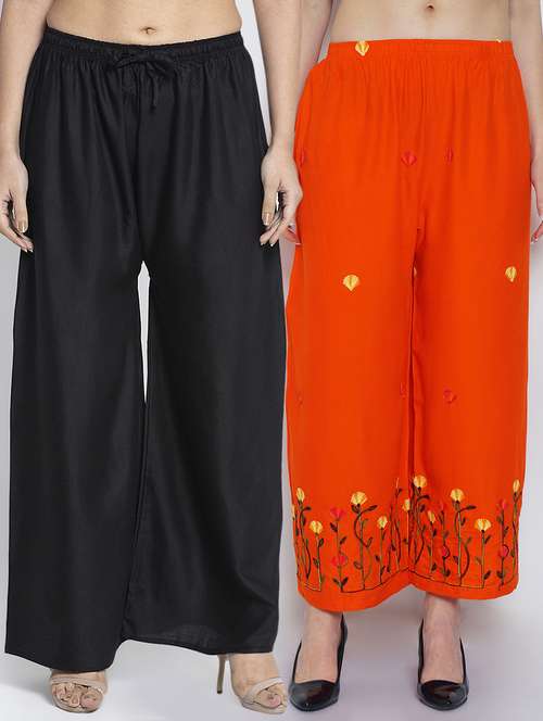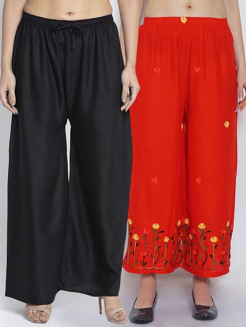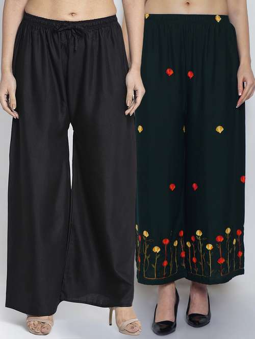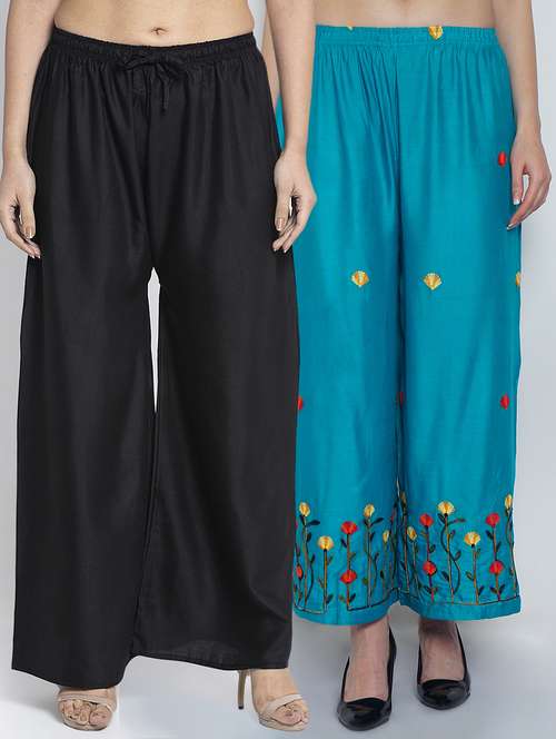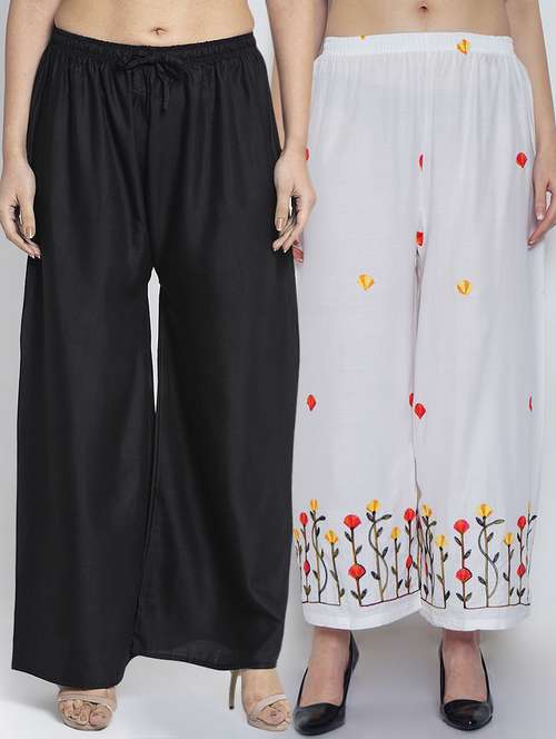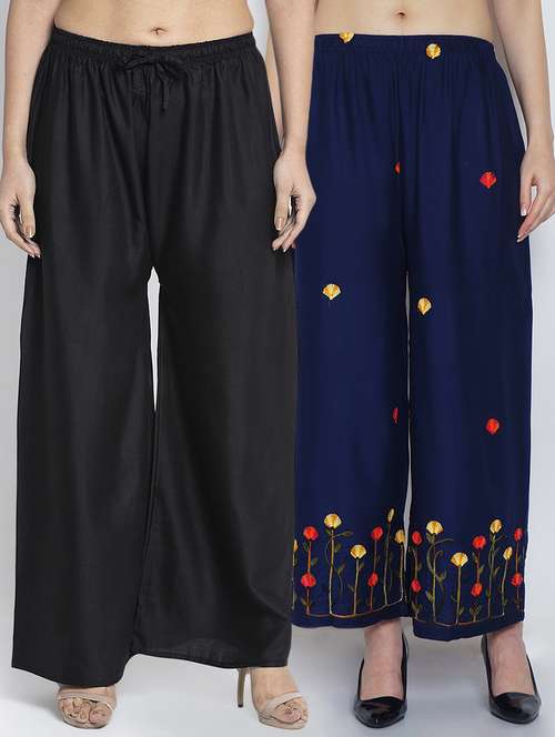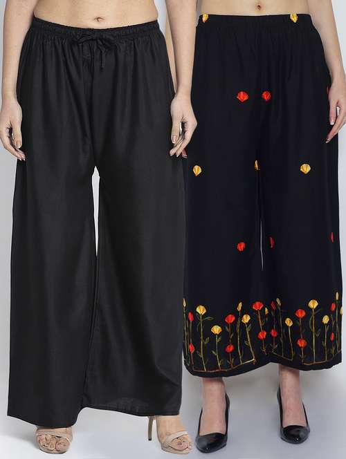 Women Rayon embroidery Print & solid palazzo are a stylish piece of casual clothing. Featuring a mid-rise, soft, elasticated waistband - these palazzo promise a perfect and comfortable fit. Available in many shades, these pair well with indo-western tunics and Kurti.