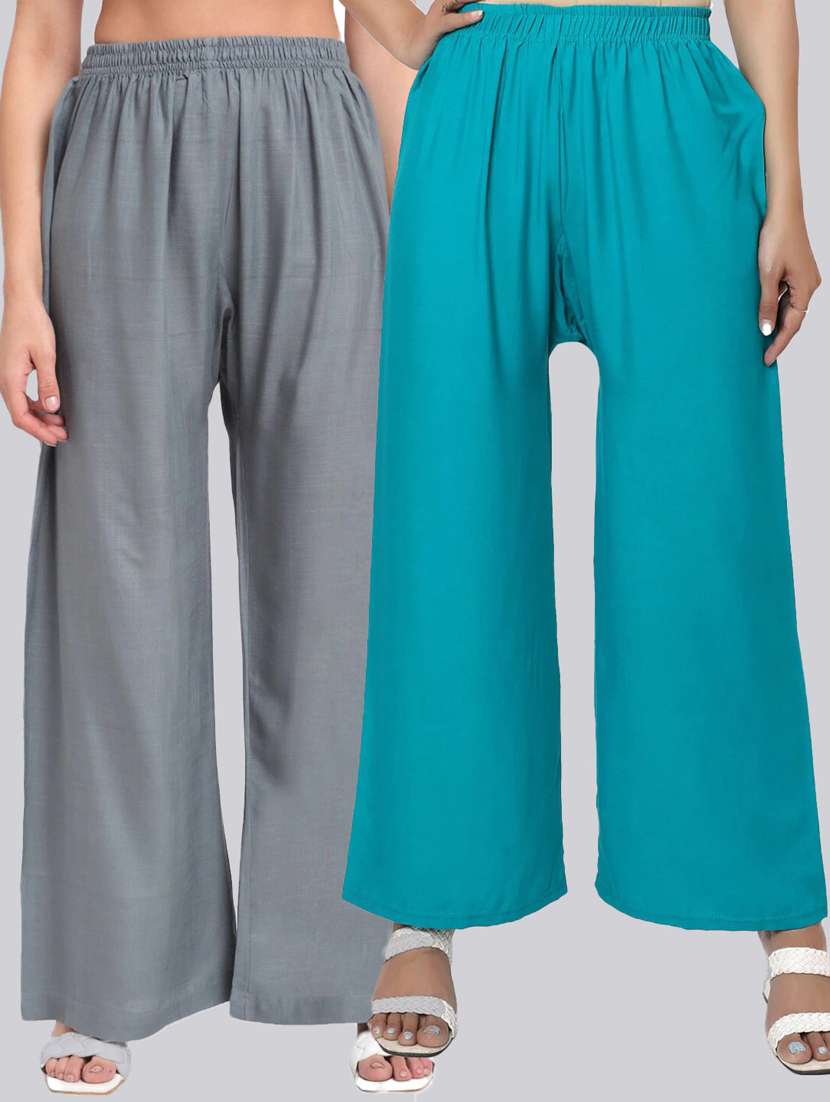 Pack of 2 Flared Women Grey and Turquoise Blue Viscose Rayon Palazzo