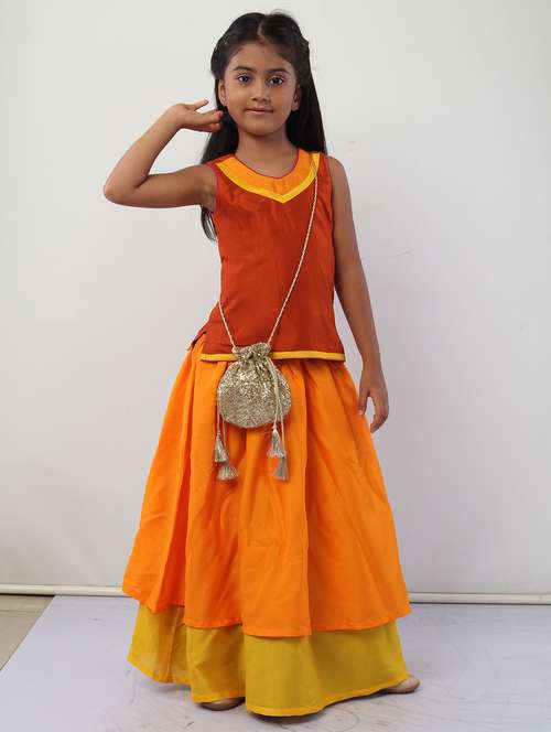 girls orange solid skirt top set