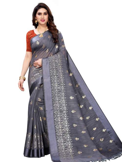 soft cotton sari with satin border, also foil work done on sari looks glamarous and attached jacqaurd woven contrast blouse makes a style statement