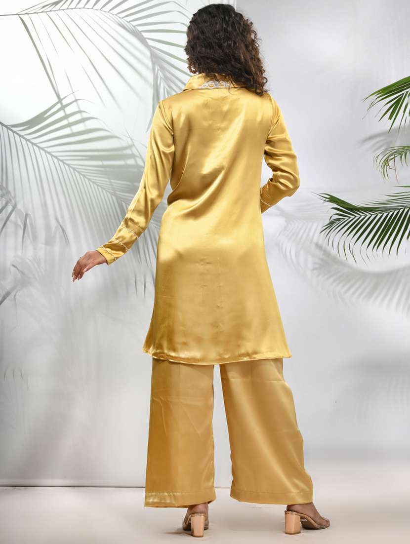 - Grab this beautiful kurta made up of satin fabric featuring shirt collar neck designs.