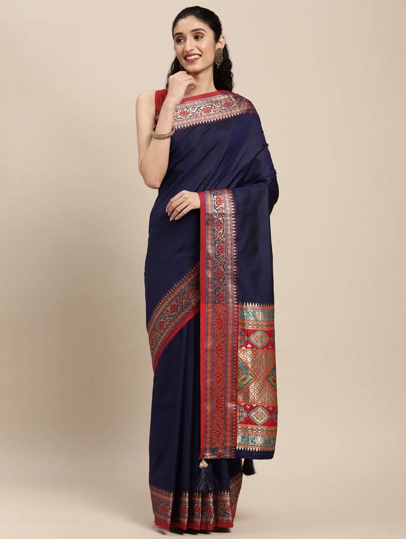 Grace meets tradition in this striking navy blue saree featuring an intricately woven red and gold border, paired with a rich ethnic pallu. The deep color gives a royal, slimming effect while the ornate motifs elevate its festive elegance. Crafted for modern women who cherish classic beauty, this saree is a perfect choice for wedding functions, festive occasions, or formal celebrations.