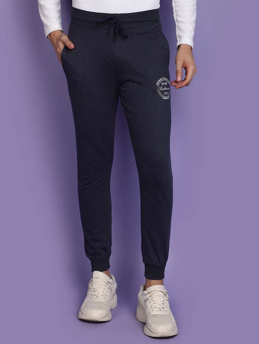 - Wish to complete the chic look on every occasion without compromising on comfort? Then do check out these elasticated joggers for active wear occasions in navy blue hues.