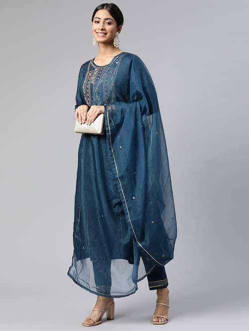 • Find gorgeous sets of ethnic wears in trending designs in blue colors suitable for evening wear of occasions.