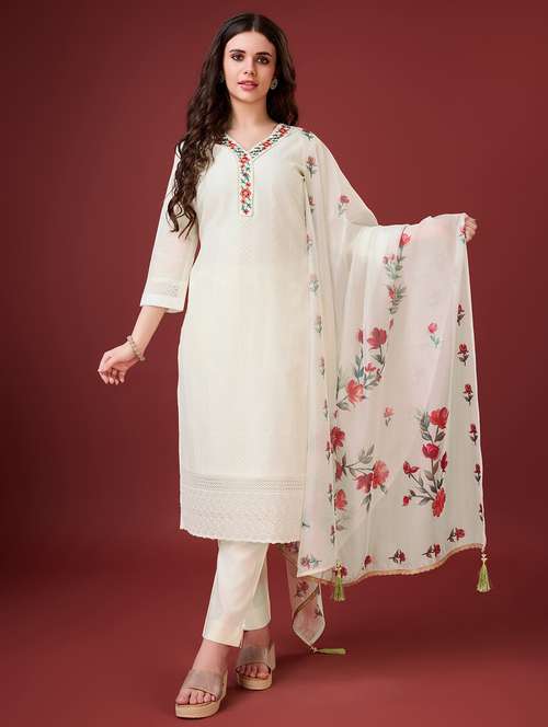 - Find gorgeous sets of ethnic wears in trending designs in off white colors suitable for festive wear of occasions.