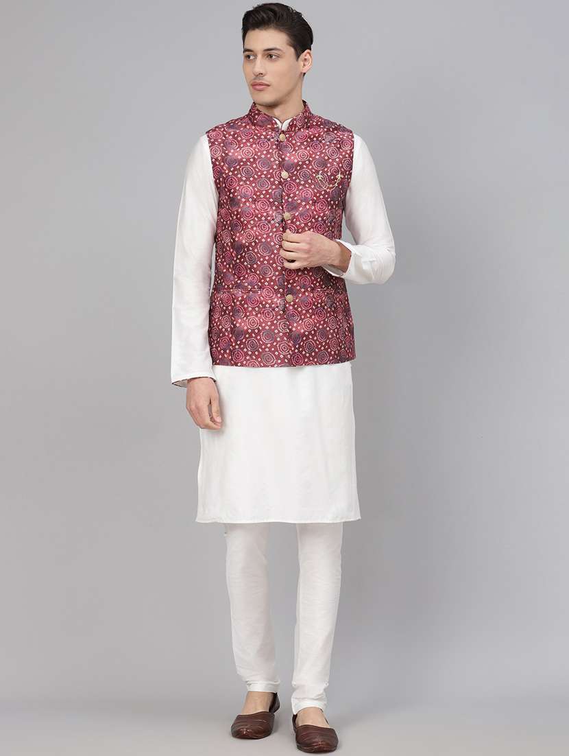- » off white solid kurta pyjama set with maroon printed nehru jacket