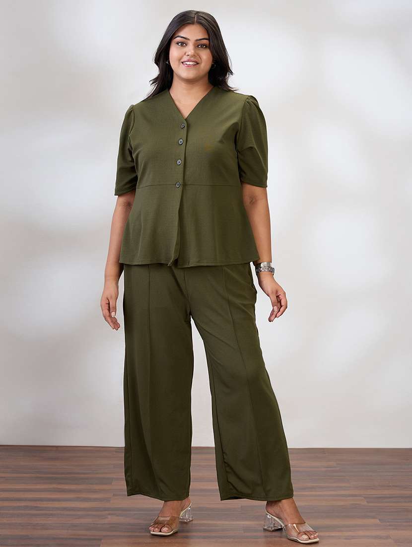 Elevate your workwear with this olive co-ord set, featuring a stylish V-neck top with puff sleeves and button closures. Crafted from soft poly lycra, the set offers all-day comfort and a sleek, tailored fit. The matching full-length trousers with mid-rise waist and button closure complete the formal look. Perfect for plus-size women who love both fashion and function.