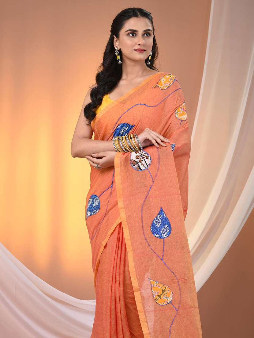 Our Orange Mulmul Cotton Soft Saree With Applique Work is a poetic masterpiece with embroidered blooms that whisper stories of nature. To enchant, pair it with a vibrant, contrasting blouse and wind-swept hair for an effortlessly romantic look.
