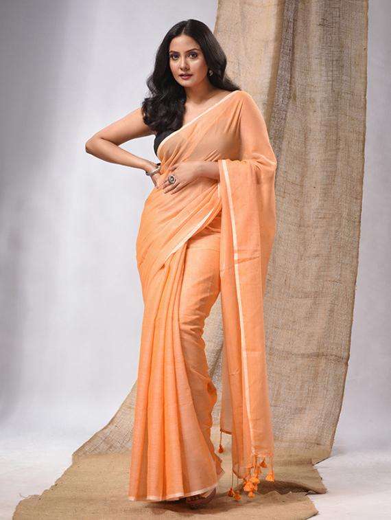 Look classy and posh in this orange cotton handloom saree. It has plain body with simplicity. The pallu is highlighted with pompom to complete the look.