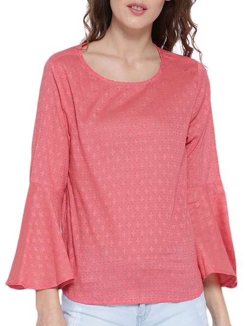 Coral pink self-design woven regular top, has a round neck, three-quarter bell sleeves, button closure on the back