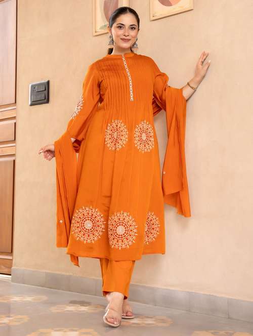 - Find gorgeous sets of ethnic wears in trending designs in orange colors suitable for festive wear of occasions.