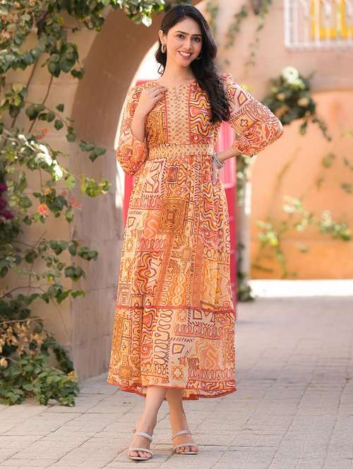 - Look and feel your best with the fresh collection of orange colorful ethnic dresses with trending diverse designs and silhouettes to choose from.