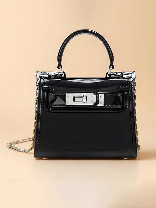 Haute Handles Women Orange Chic and glossy mini sling bag with a sleek silver clasp and chain detail